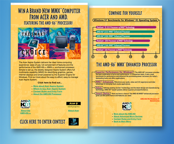 Client: AMD (Advanced Micro Devices) | Project: AMD/Acer Co-brand Contest | Role: Site developer I 1996-1997