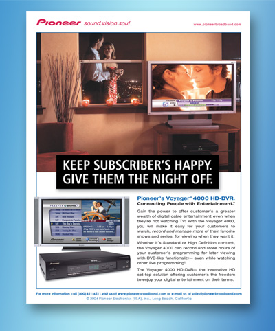Ad supporting latest iteration of Pioneer's DVR IPG (Interactive Program Guide).