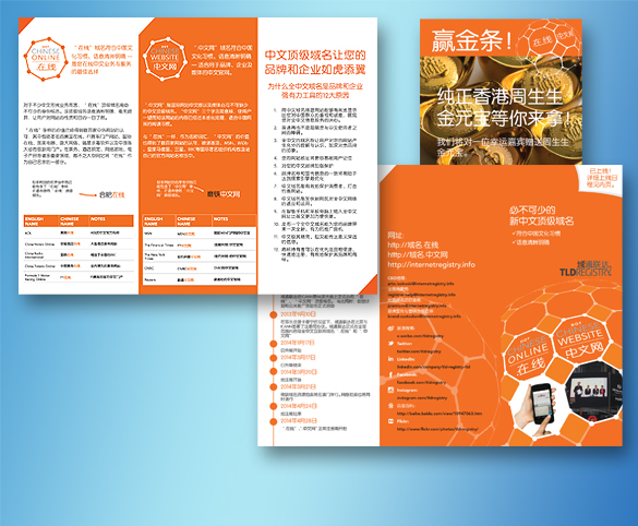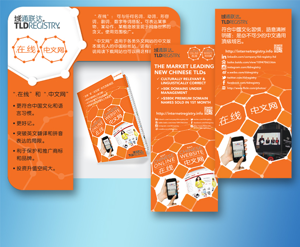 The sales and marketing collateral represented both English and Chinese target audiences to impress upon audiences TLD's Chinese-centric Internet products provide unique channels for both consumer and on-line business models.
